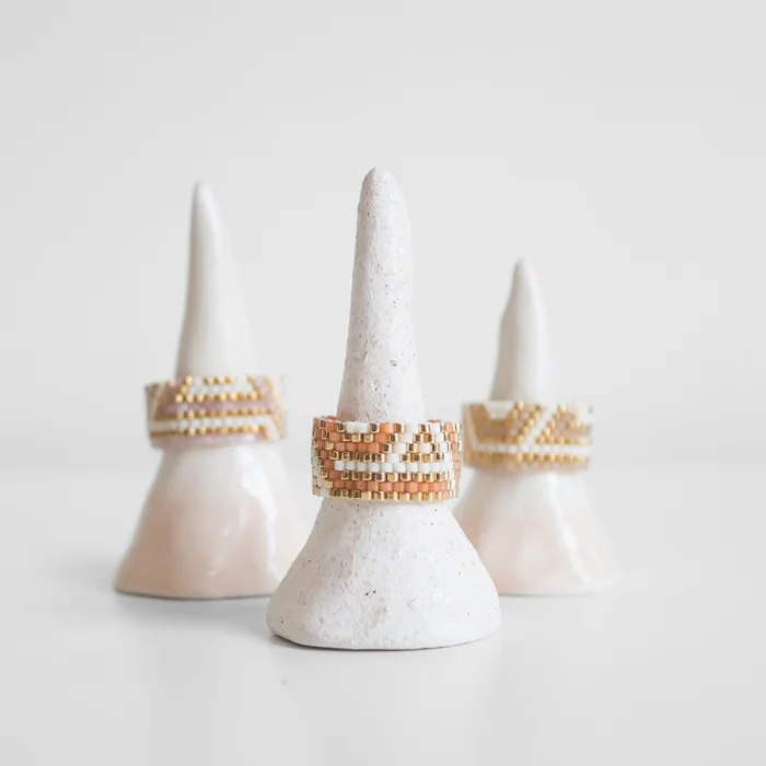 Rings are handsewn with glass beads. It is pretty robust and will not be damaged unless it is forced. It is not flexible and does not stretch much over time. There is no harm in contact with water.