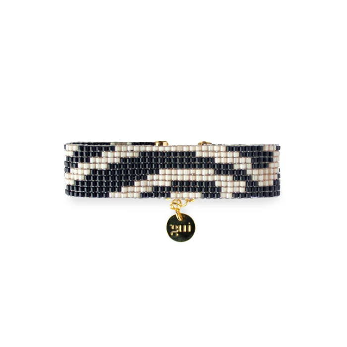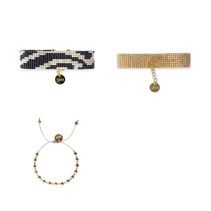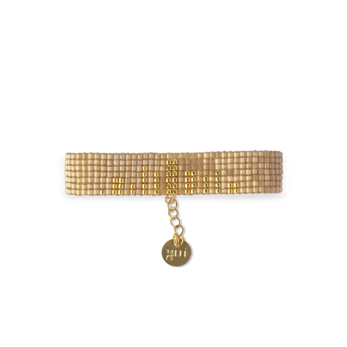 Hills bracelet is handsewn by using glass beads. Each piece is carefully crafted by our skilled artisans, to reach the utmost handmade quality. The metal parts of the bracelet are made of brass plated with 18 karat gold. The bracelets adapt to different wrist thicknesses with the end chain. Bracelet thickness: 1,5cm