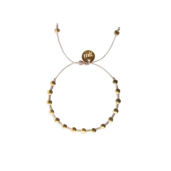 Noon bracelet is produced with circular shaped 18 carat gold plated brass beads. There are beige colored glass beads between the brass beads. The bracelet can be adjusted for different bracelet thicknesses with the help of the lift knot.