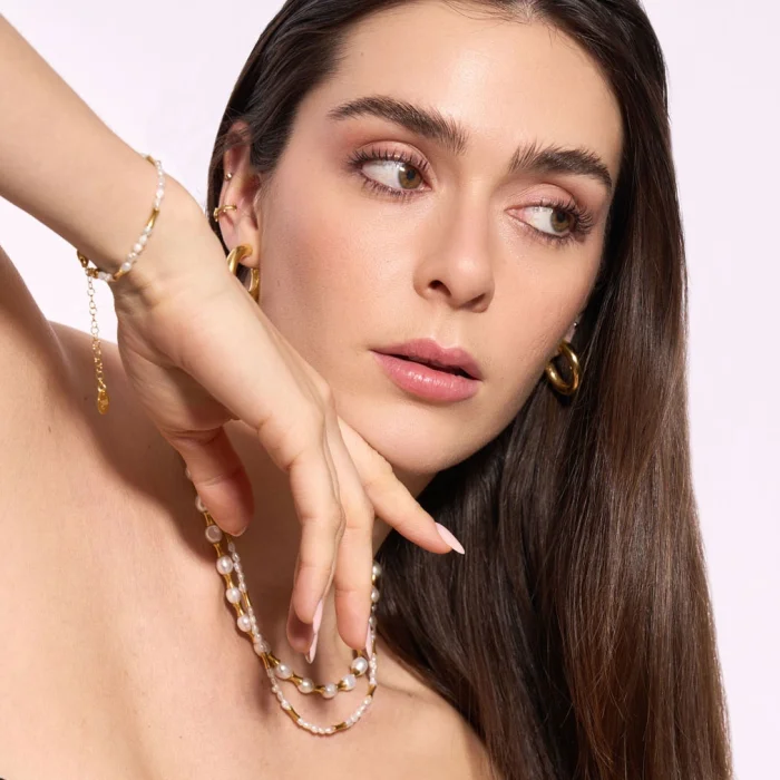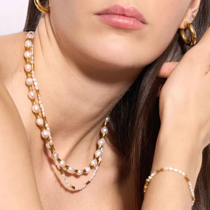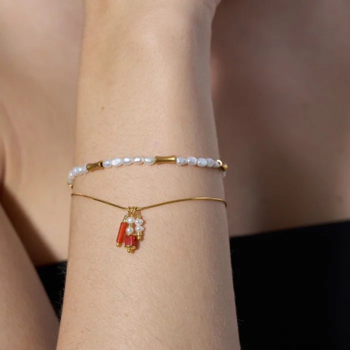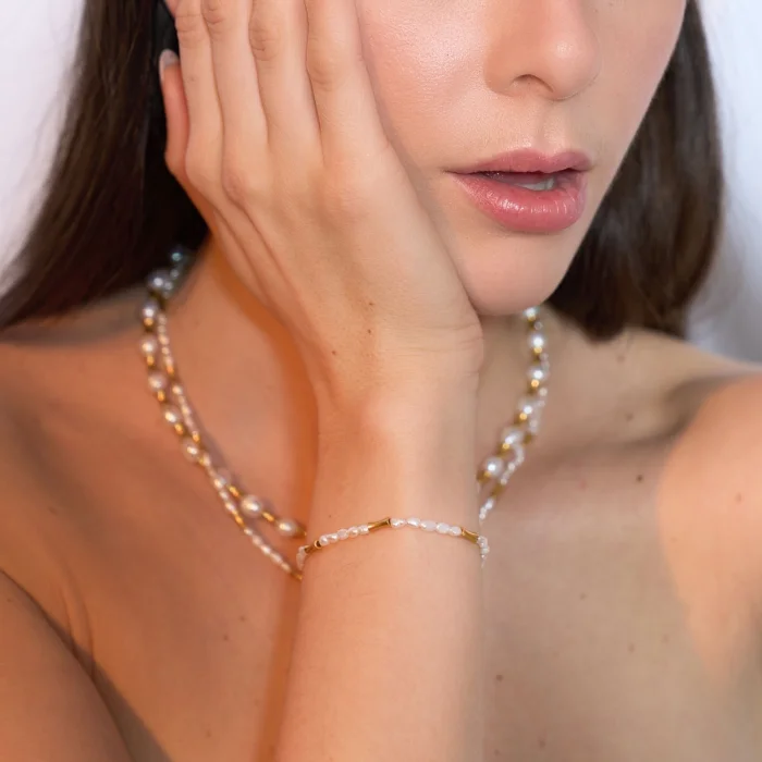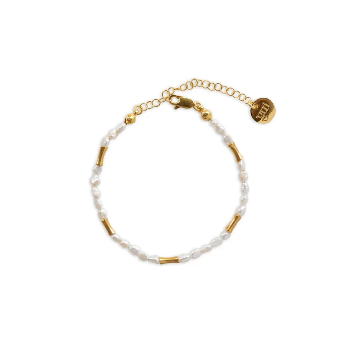addition to natural pearls, the Muse bracelet features 18-karat gold-plated brass cast beads. The adjustable lock section is 18 carat micron gold plated on 925 sterling silver. Wristband length: min.16 – max.20.5 cm