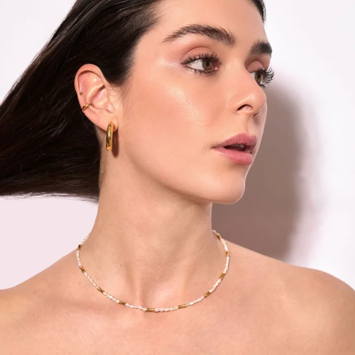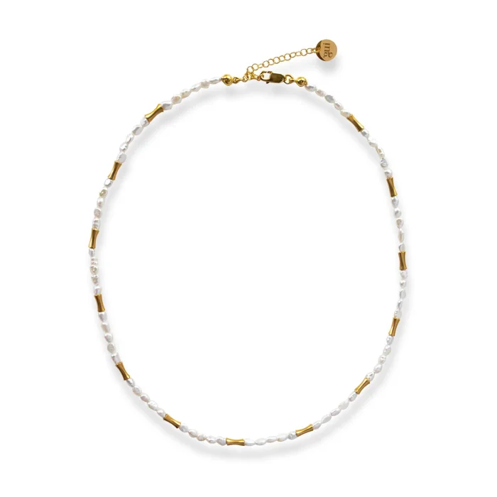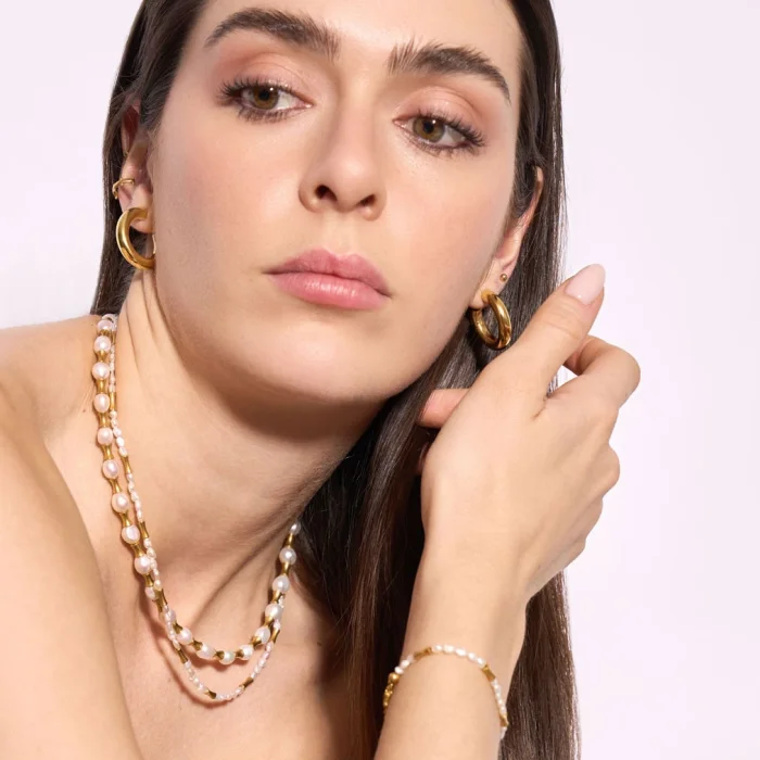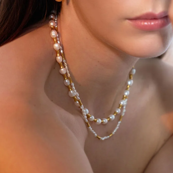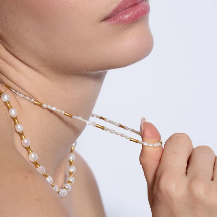 The Muse necklace features natural pearls as well as brass cast beads with 18-karat gold plating. The adjustable lock section is 18 carat micron gold plated on 925 sterling silver. Necklace length: min.39.5 – max.44 cm