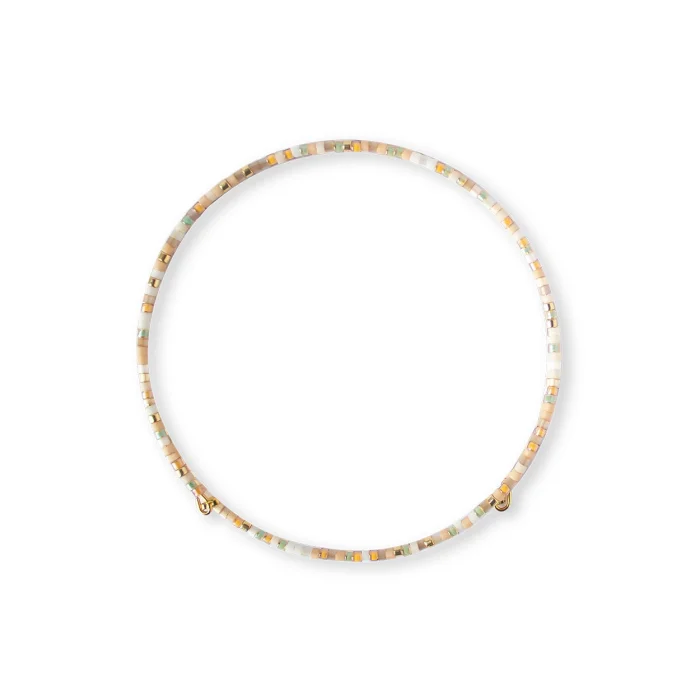 Produced with steel wire and glass beads. It is flexible and can be wrapped easily around the wrist. There is no harm in contact with water.