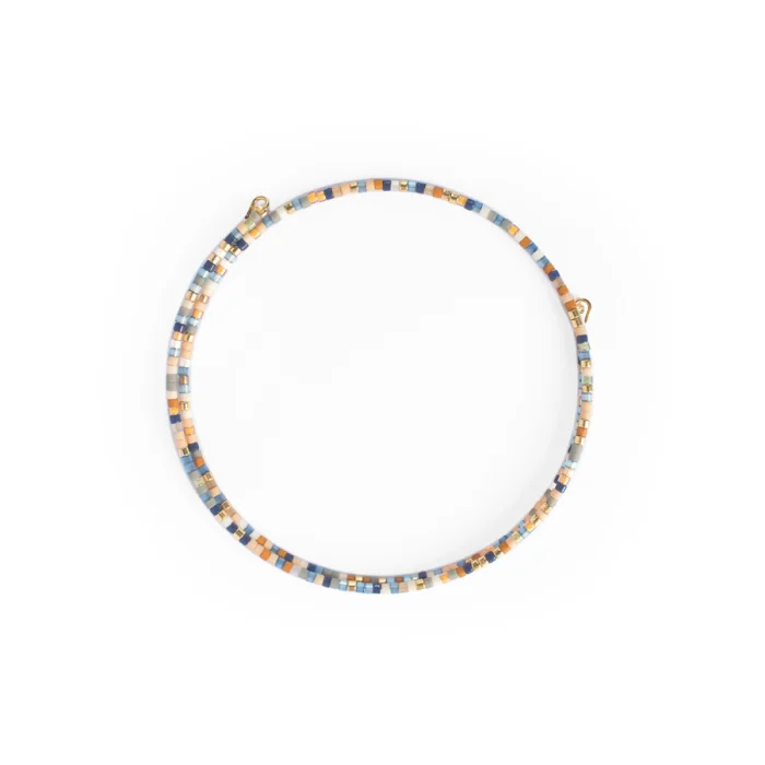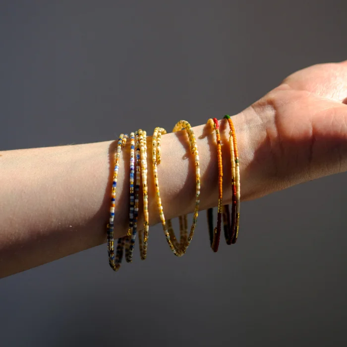 Produced with steel wire and glass beads. It is flexible and can be wrapped easily around the wrist. There is no harm in contact with water.