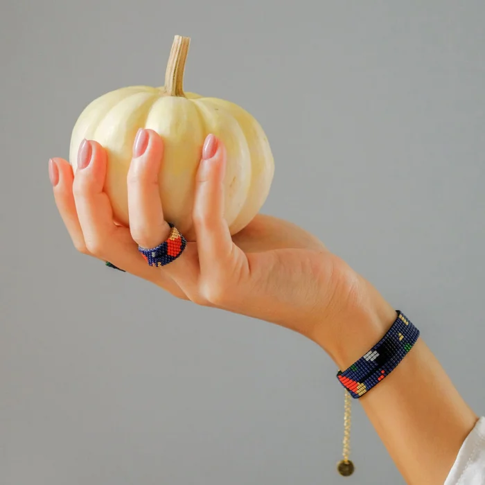 Rings are handsewn with glass beads. It is pretty robust and will not be damaged unless it is forced. It is not flexible and does not stretch much over time. There is no harm in contact with water.