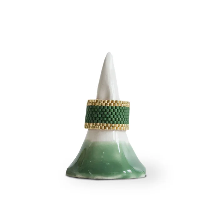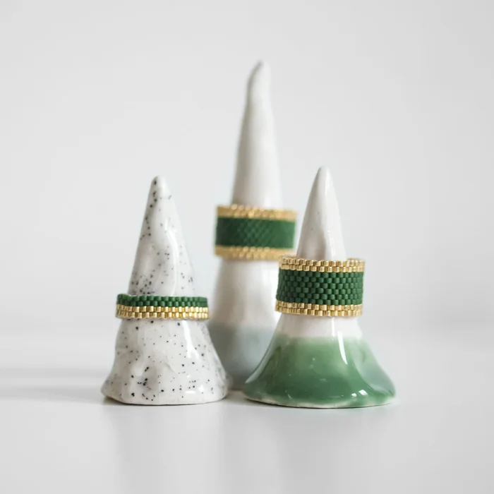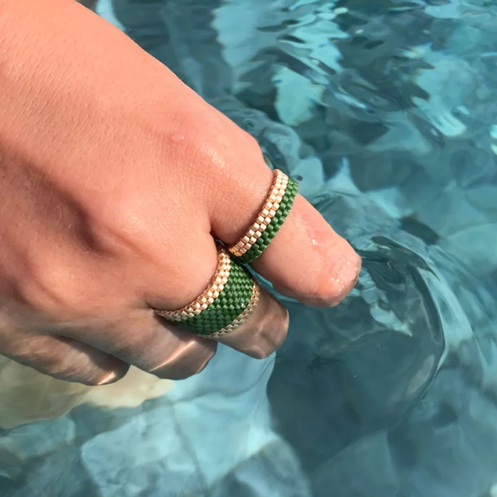 Rings are handsewn with glass beads. It is pretty robust and will not be damaged unless it is forced. It is not flexible and does not stretch much over time. There is no harm in contact with water.