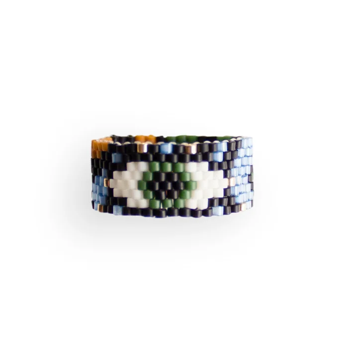 Rings are handsewn with glass beads. It is pretty robust and will not be damaged unless it is forced. It is not flexible and does not stretch much over time. There is no harm in contact with water.