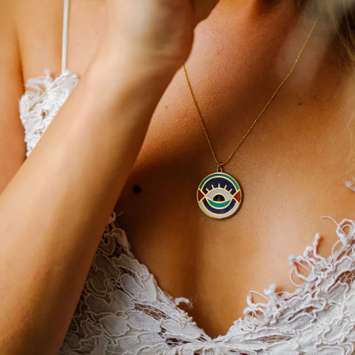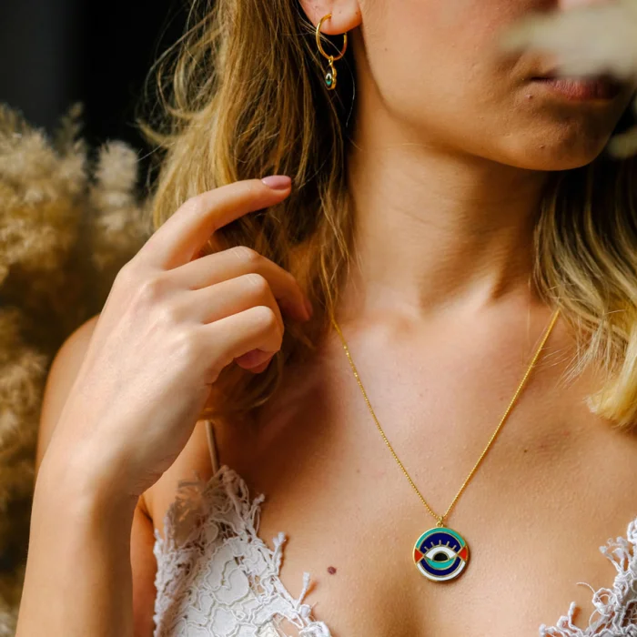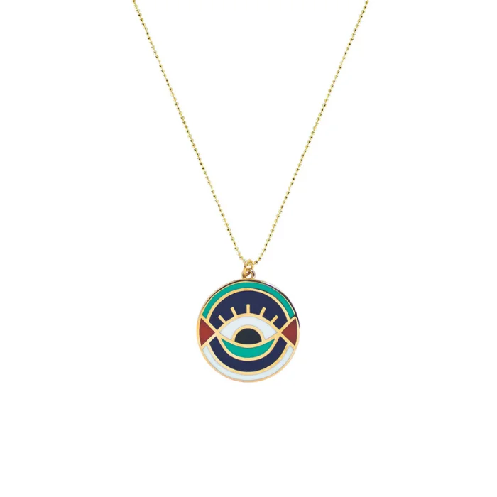 Necklace chains are 22K micron gold plated. The pendant is made of bronze, the figures are enameled and 18 carat gold plated.