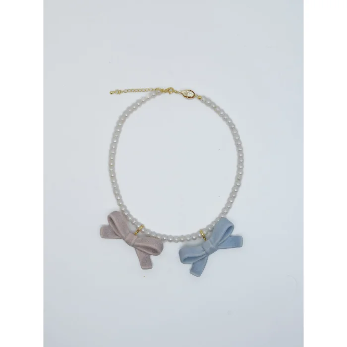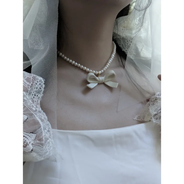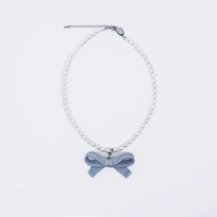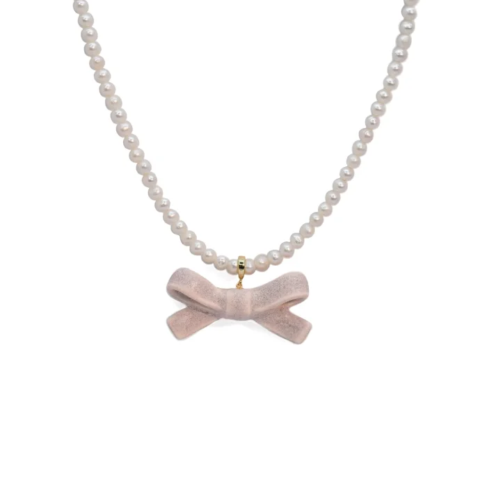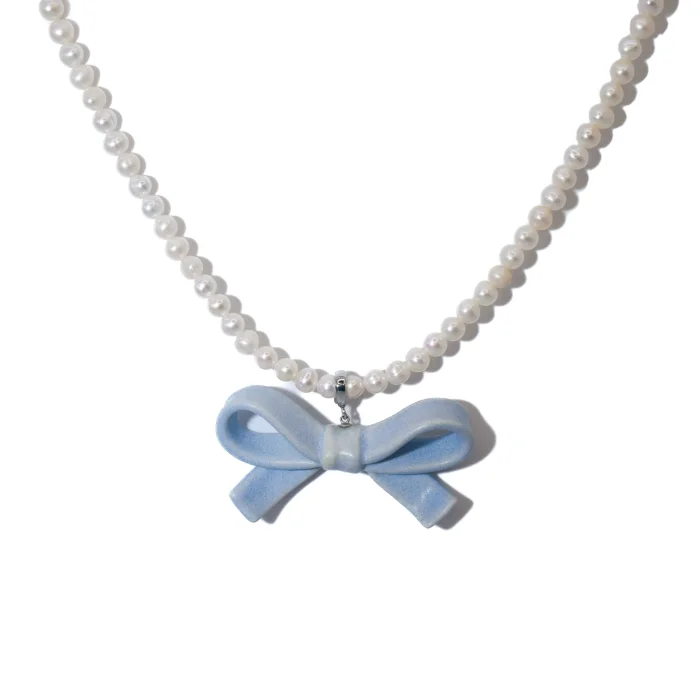 Product: Bowtie Maniac - Medium Ceramic Ribbon Charm Bowtie Freshwater Pearl Necklace