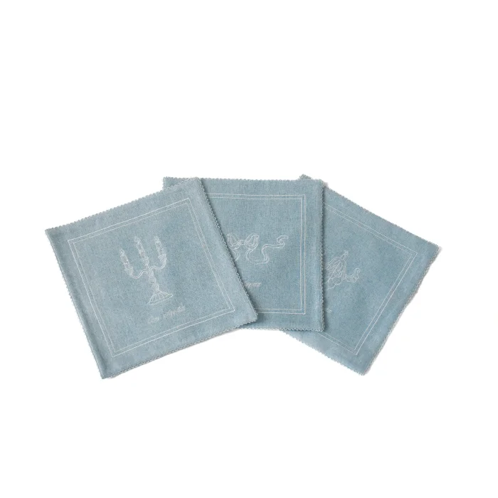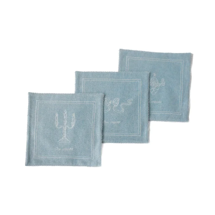 These vintage-inspired embroidered tea towels add an elegant touch to your kitchen or dining table. Featuring intricate candelabra, vine, and bow designs, these towels bring a timeless charm to your table décor while providing practical use. Crafted from high-quality fabric, they are durable and stylish, ideal for everyday use or special occasions. Perfect as a thoughtful gift or a delightful addition to your own home, these tea towels effortlessly combine functionality and sophistication.Product: Elegant Vintage-Inspired Embroidered Tea Towel Set – Candelabra & Bow & Vine Design -3 piece set small vingtage blue
