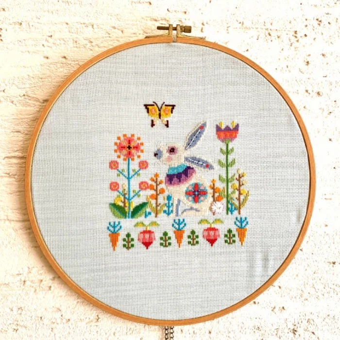 A completely handmade cross-stitch painting framed by a wooden hoop.