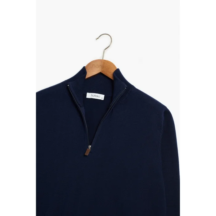 Quarter-Zip, Plain Design, Knit Sweater with Faux Leather Zipper Pull