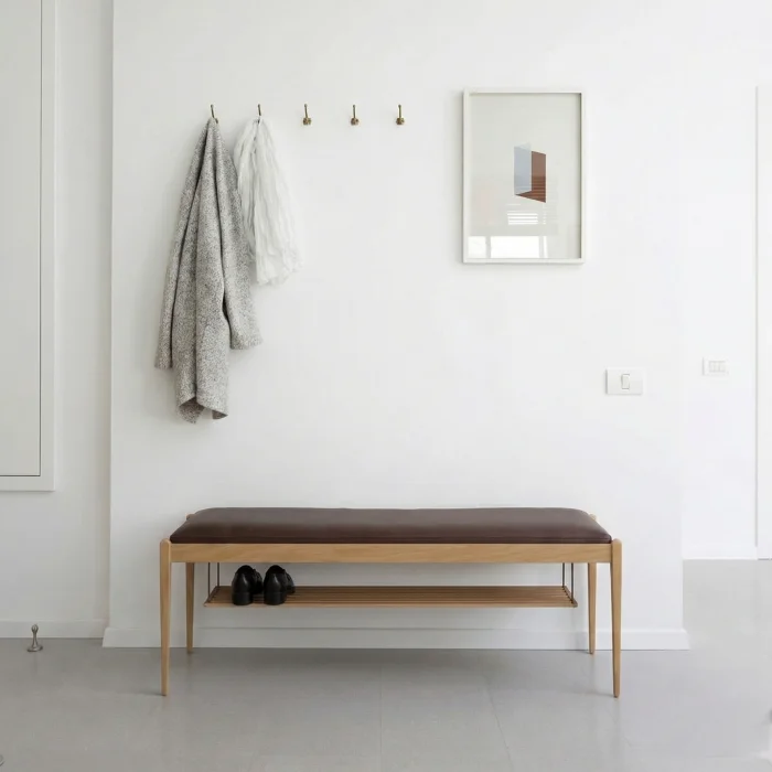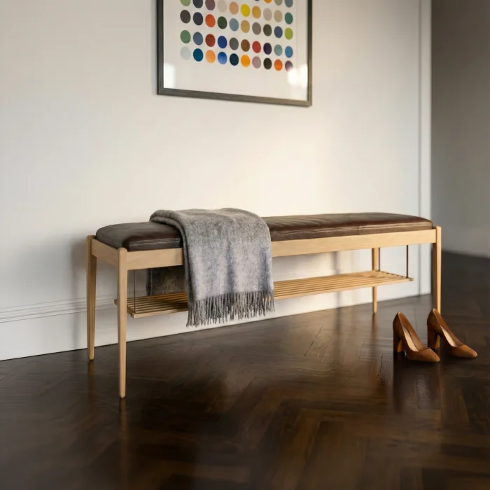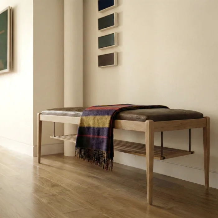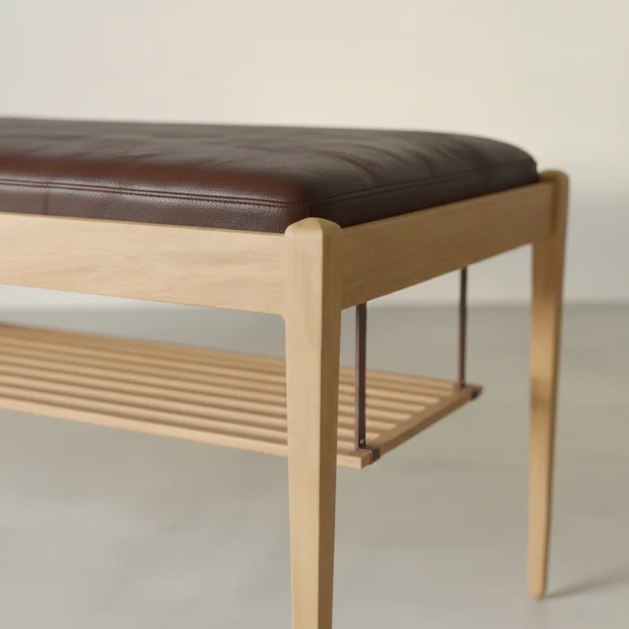 Atria Bench combines the warmth of natural oak wood with the timeless character of real leather. The slim proportion foot structure and clear frame form give the product a light silhouette, while the real leather seating area used on the upper surface creates a sophisticated contrast.