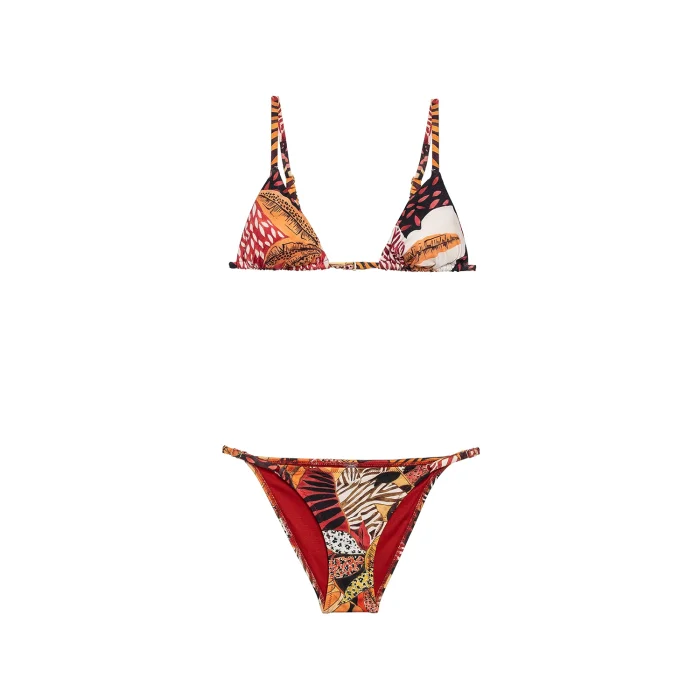 African breezes will be warmer this summer. Triangular bikini. There is a golden ring -shaped metal accessory in the front. It should connect from the back. Shoulder straps can be fully adjusted with the ring details of the golden metal setting. There are removable chest containers. & nbsp; model S is wearing body. Model Dimensions: Length: 1.70, 81/64/91 Fabric Features: 85 %PES, 15 %EA