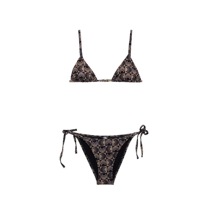 Heliophilia monogram patterned in dark beige and black colors. Triangular bikini six. It can be adjusted by connecting from the sides. There is a golden ring -shaped metal accessory where the side laces are attached. It provides moderate closure. Model S is wearing body. Model Dimensions: Length: 1.70, 81/64/91 Fabric Features: 85 %PES, 15 %EA