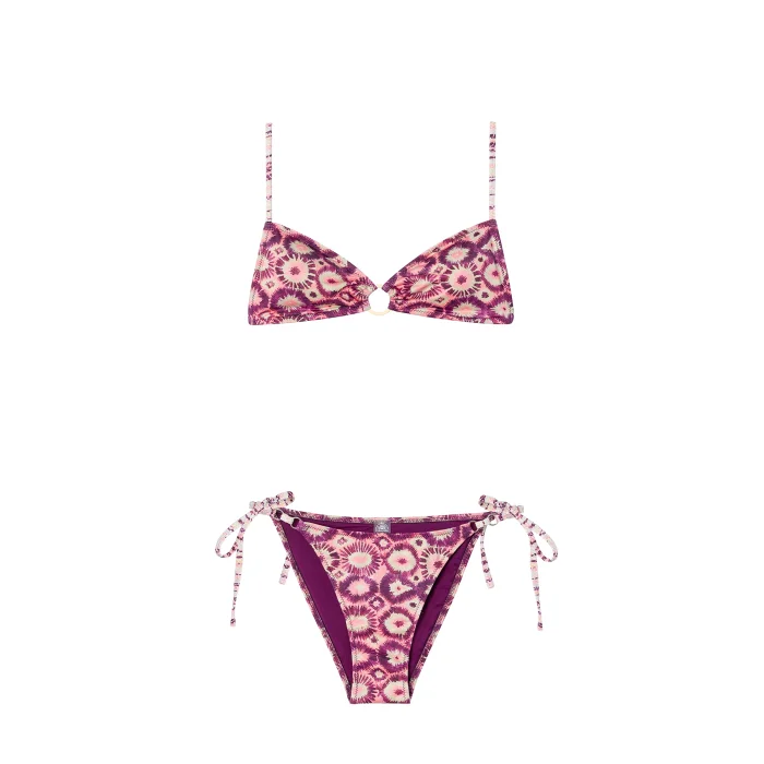 Triangle bikini bottoms. It can be adjusted by connecting it from the sides. On the side laces, there are metal accessories in the form of a gold ring, which follows each other to give the effect of a chain. It provides a moderate degree of closure.