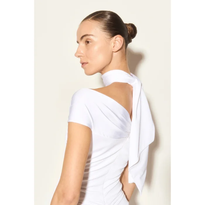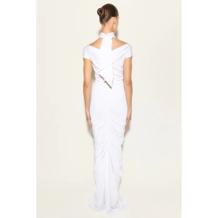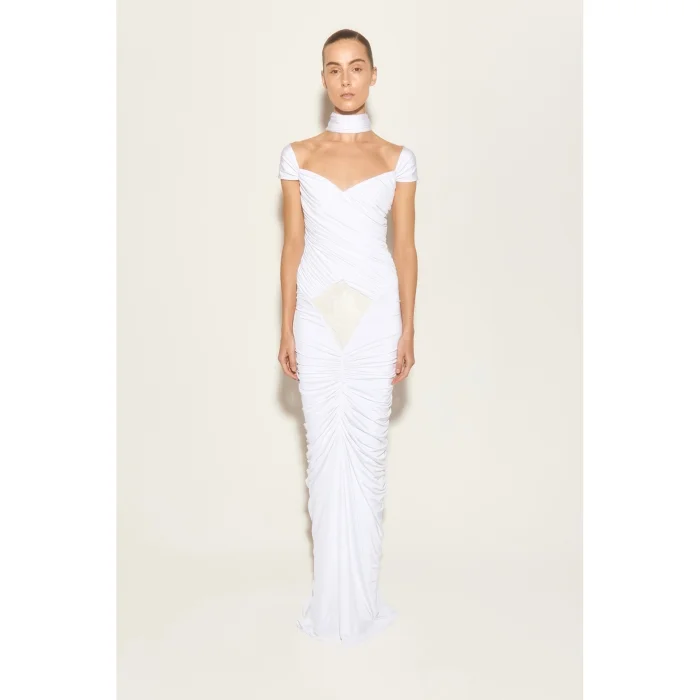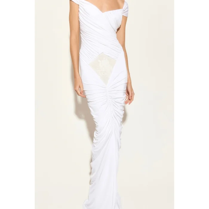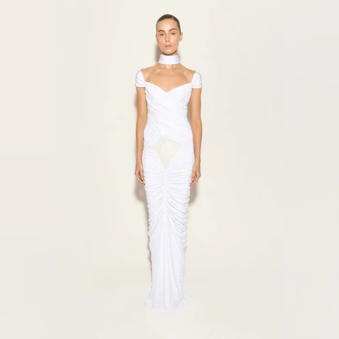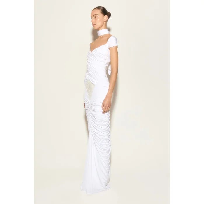Long jersey dress with ecru, lace detailing, draped neckline, detachable neck shawl