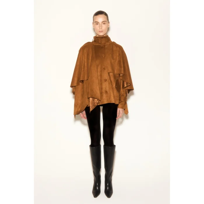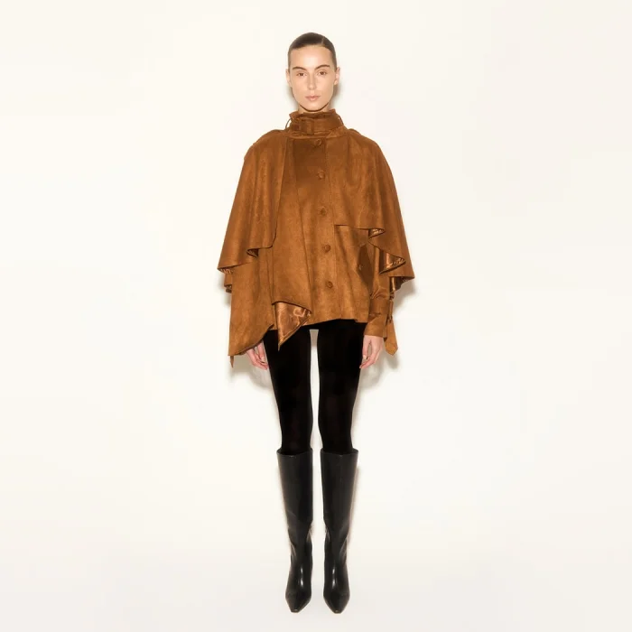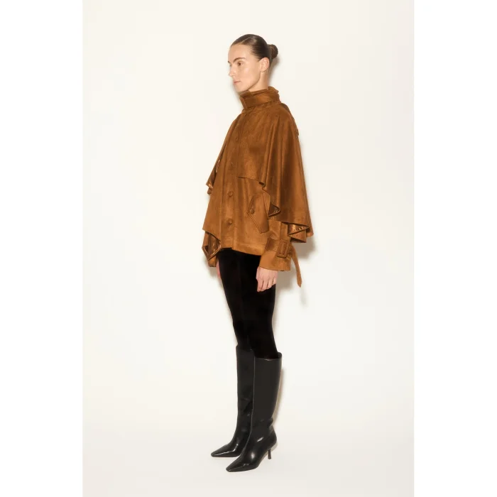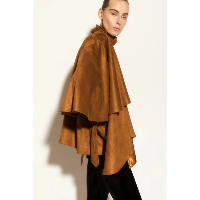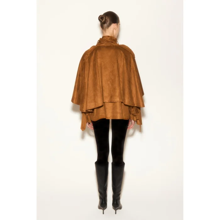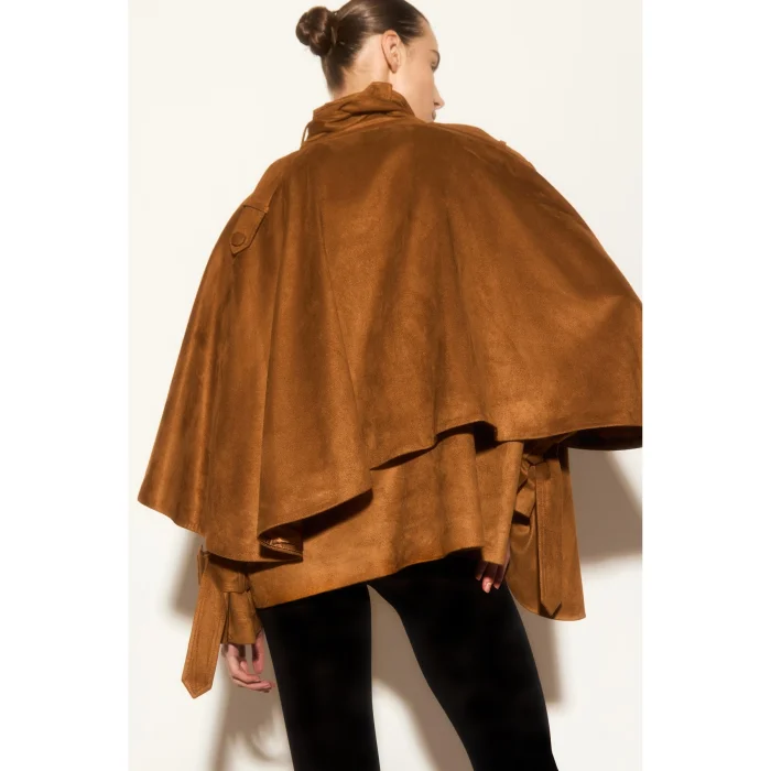 Tan jacket with suede texture, cape detail, belted collar design