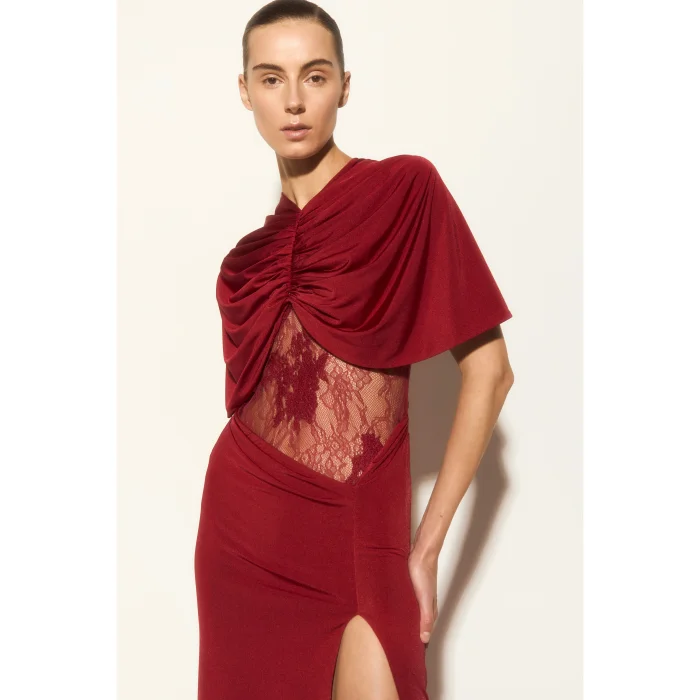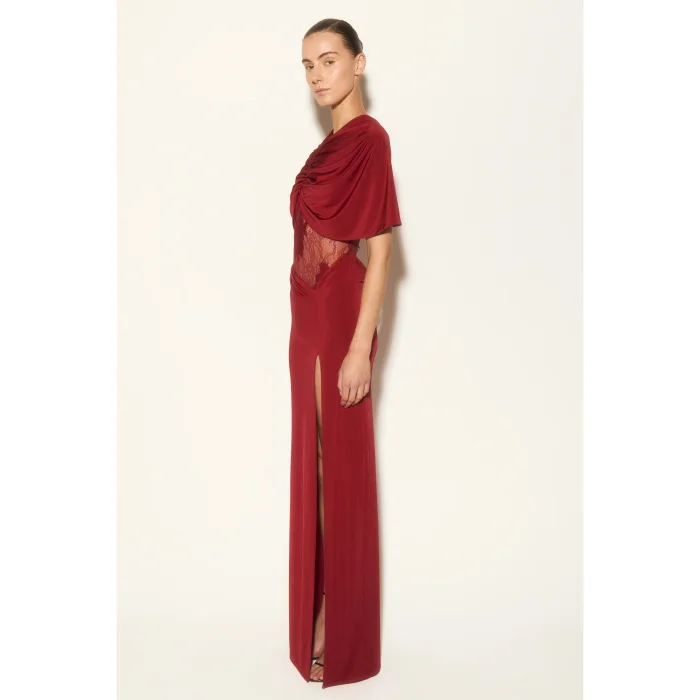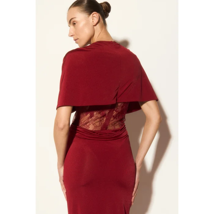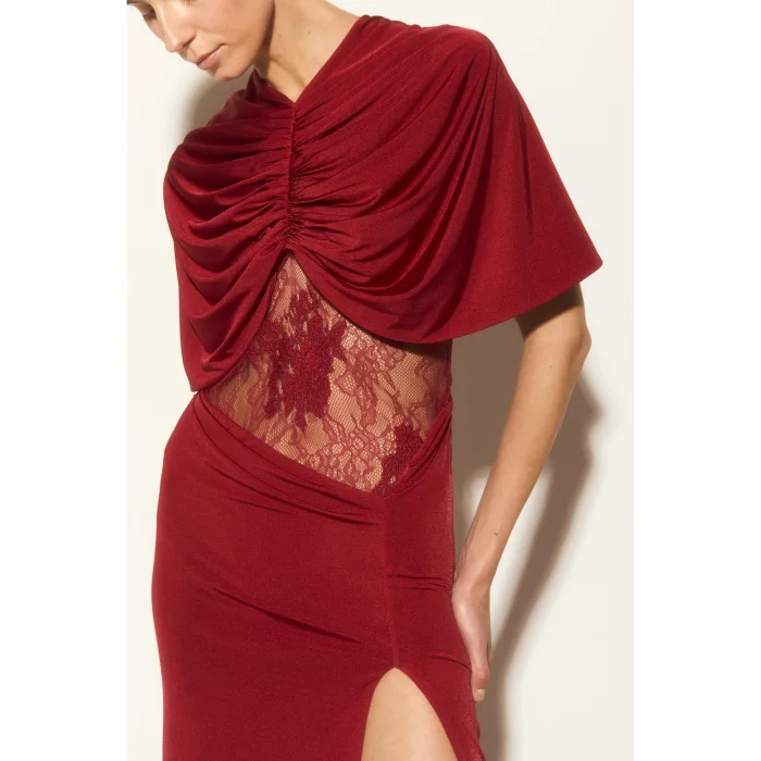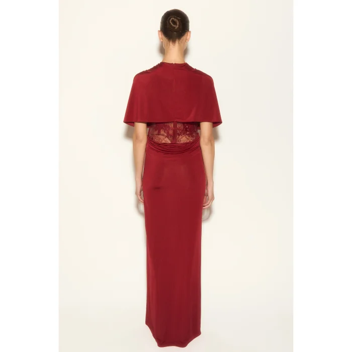 Burgundy, jersey maxi dress with cape detailing and lace detail