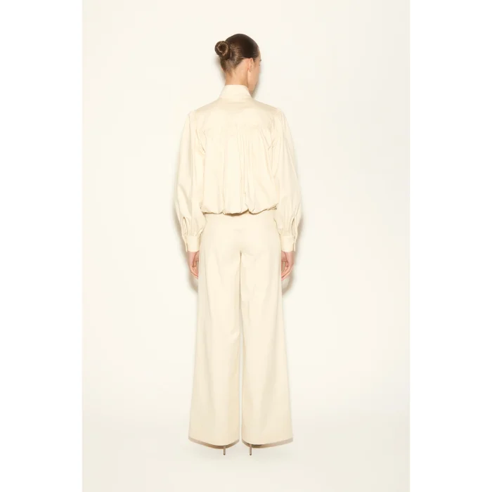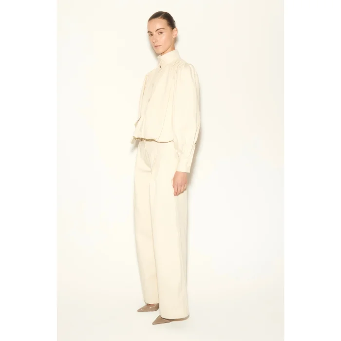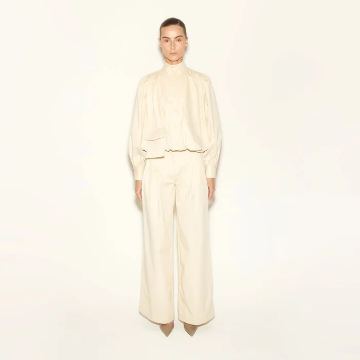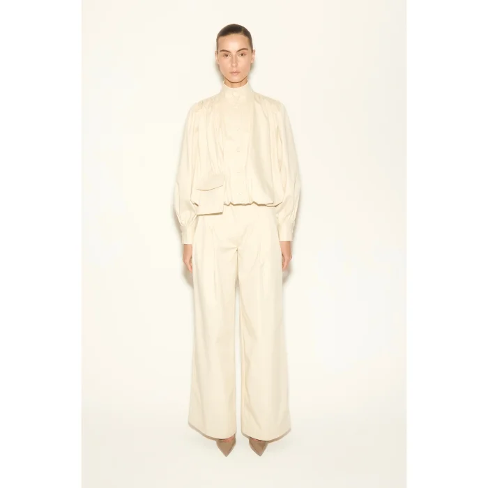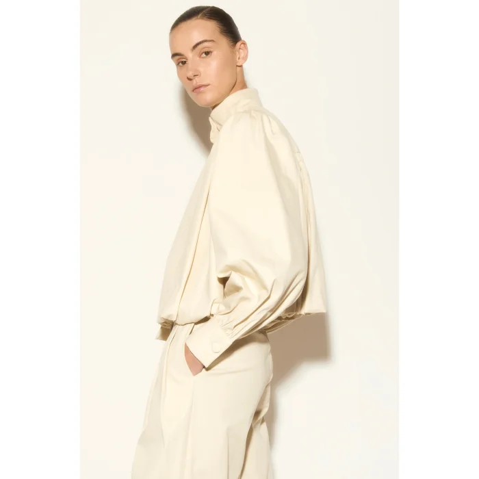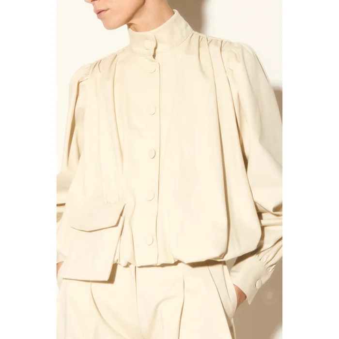 Ecru jacket with high collar, balloon sleeves, pocket detail button closure