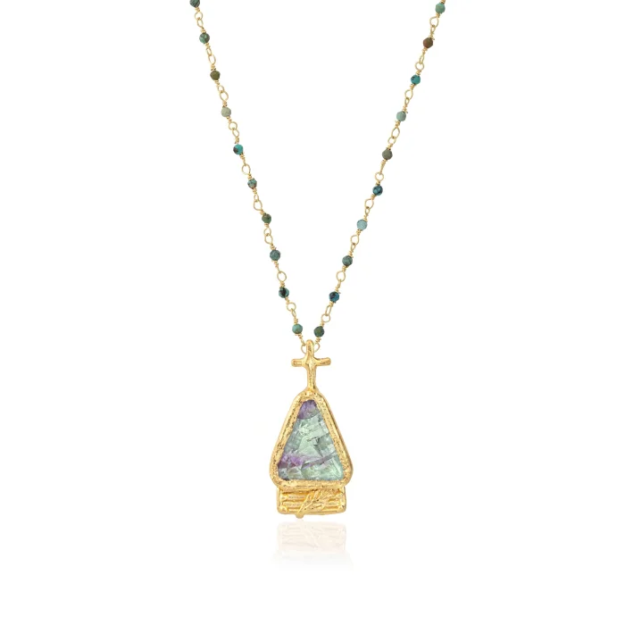 The Pyramis necklace is completely handcrafted with 24-carat gold plating on 925 sterling silver. It is finished with fluorite stone and turquoise chain.