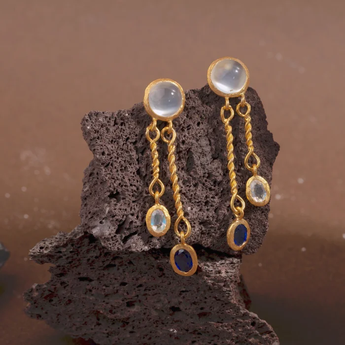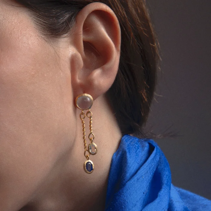Completely handmade and set with moonstone, rainbow moonstone, and lab-grown sapphire.