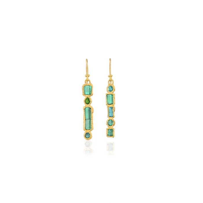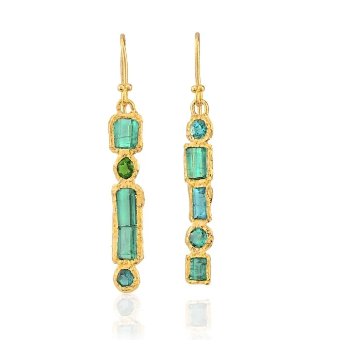 Viridia Earrings are made with 925 sterling silver 24k gold vermeil. Completely handmade and set with blue-green tourmaline gemstone.
