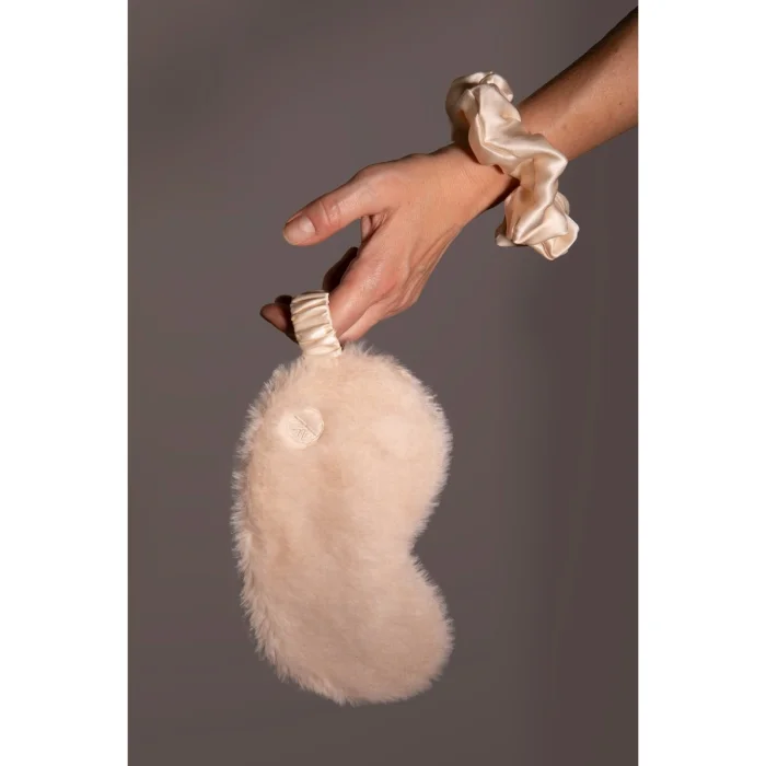 EYE MASK: FRONT: 100% POLYESER BACK: 100% SILK HWB COVER: 100% POLYESTER SCRUNCHIE: 100% SILK