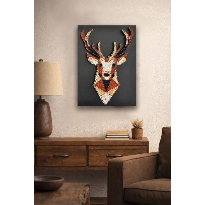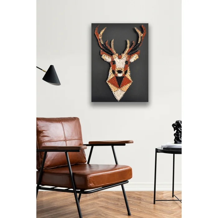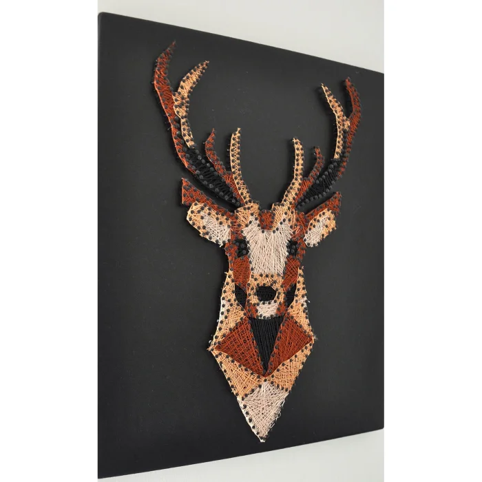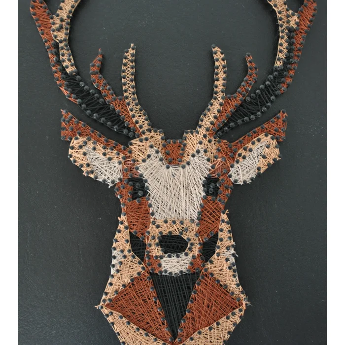 It is a figurative work embroidered with nails and colored threads on a black leather background. Cubic deer motif was created using natural colors.