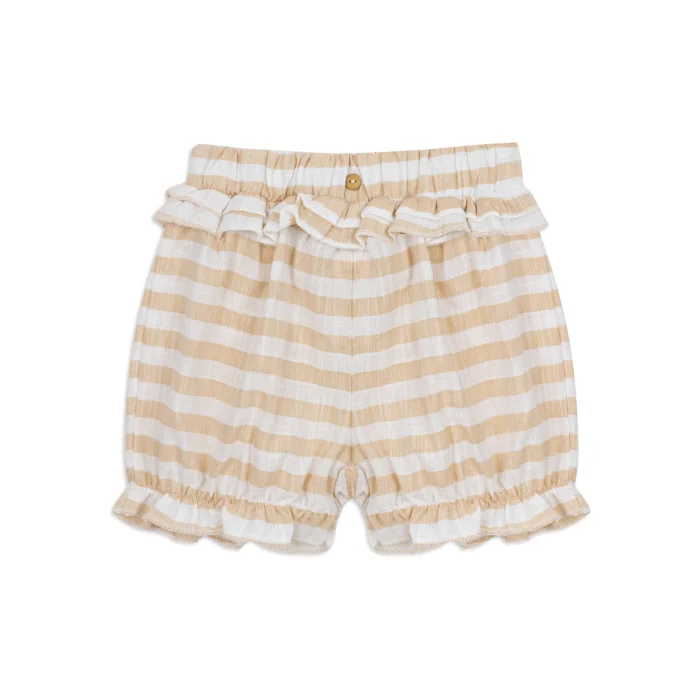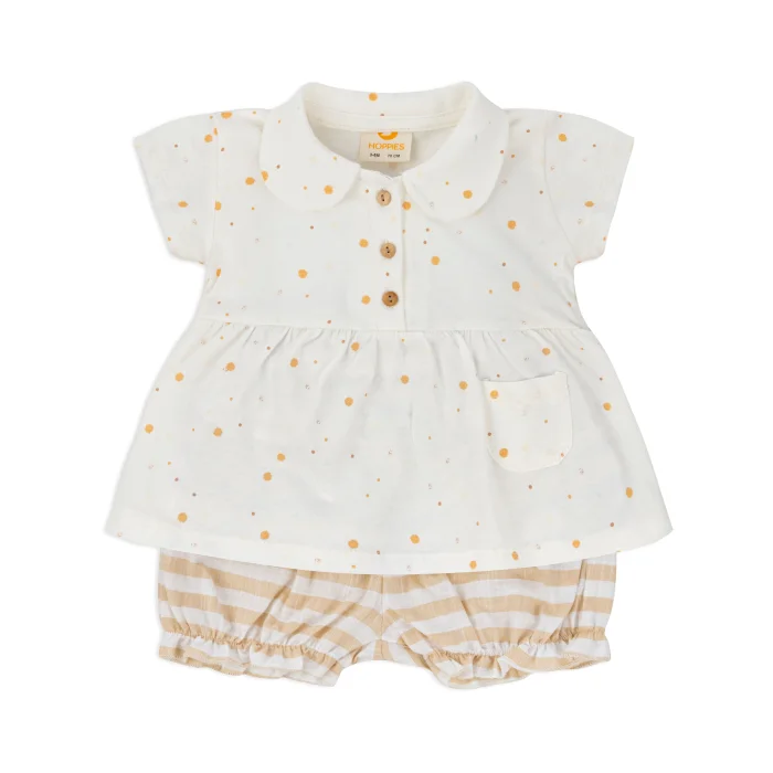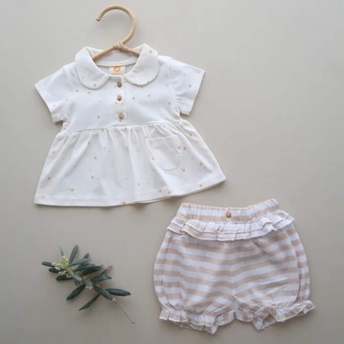 is a striped patterned blommer shorts set made of 100 % natural cotton OEKO-TEX standard fabric, baby neckline, wooden button closure at the front, flywheel from the front, pocket detail, short sleeve, polka dot patterned t-shirt and 100 % natural cotton fabric, with flounces at the waist and legs, wooden button details, elastic waist. Thanks to its breathable flexible texture and easy donning, it is ideal for your baby's comfort. It allows you to combine comfortably with cream body color and pastel polka dot tones.