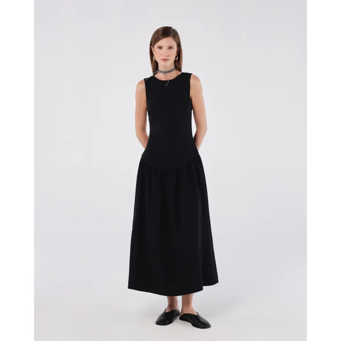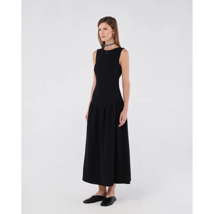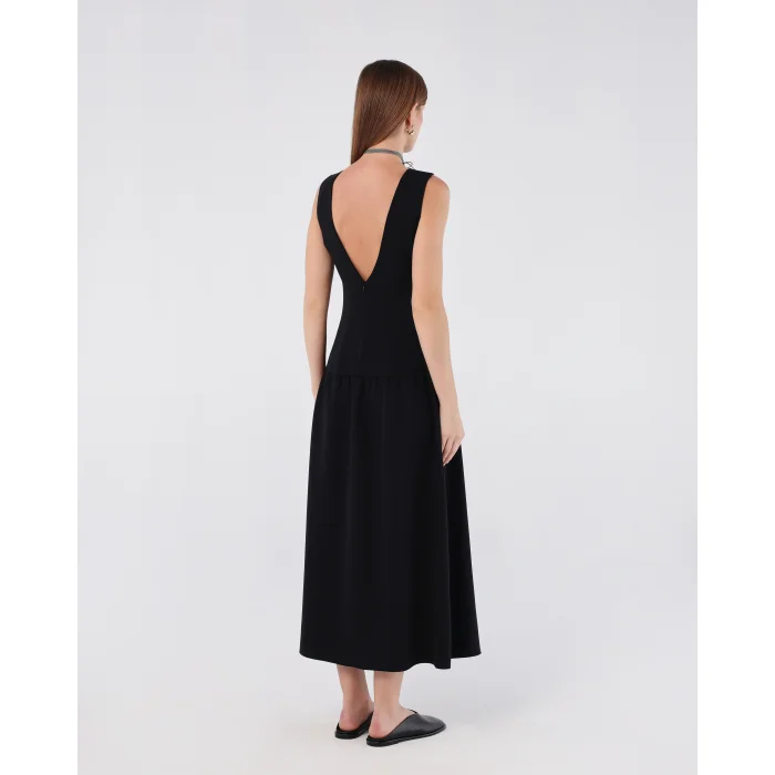 Classic boat neckline at the front for a refined, elegant look. Deep V-cut back adds a dramatic and sophisticated touch. Flattering fitted bodice transitions into a flowing midi-length skirt. Hidden back zipper ensures a smooth, seamless fit. Crafted with a timeless silhouette perfect for both formal and casual occasions. Model is 174 cm tall and wearing size XS. This dress blends classic elegance with a modern twist, making it ideal for a variety of occasions.
