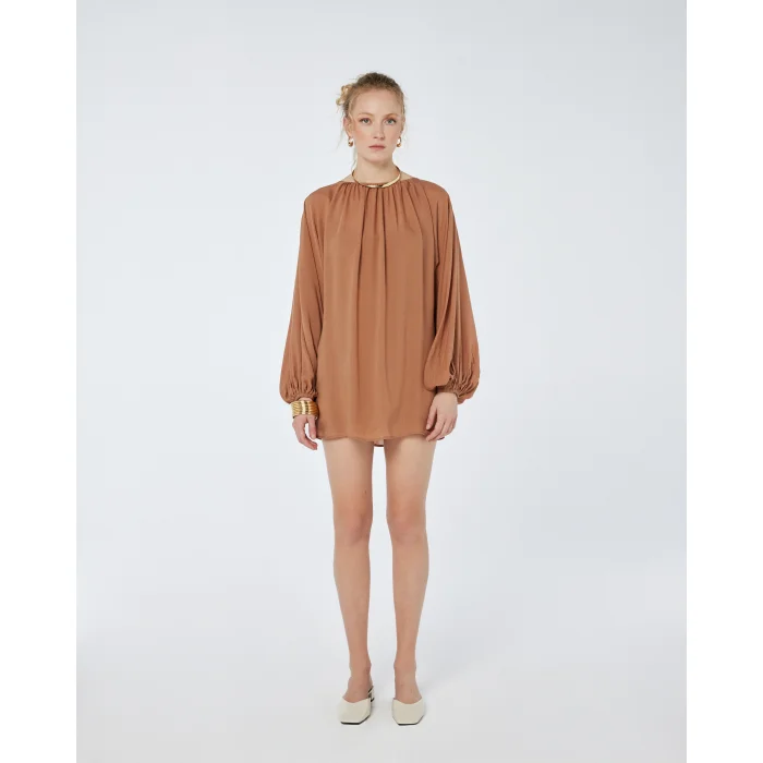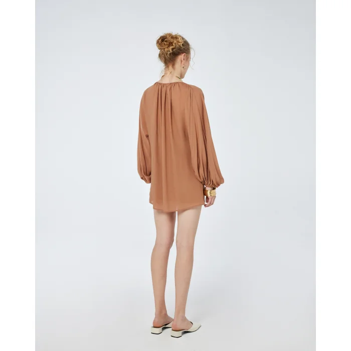 Billowy long sleeves with elasticated cuffs for a voluminous, effortless drape.
