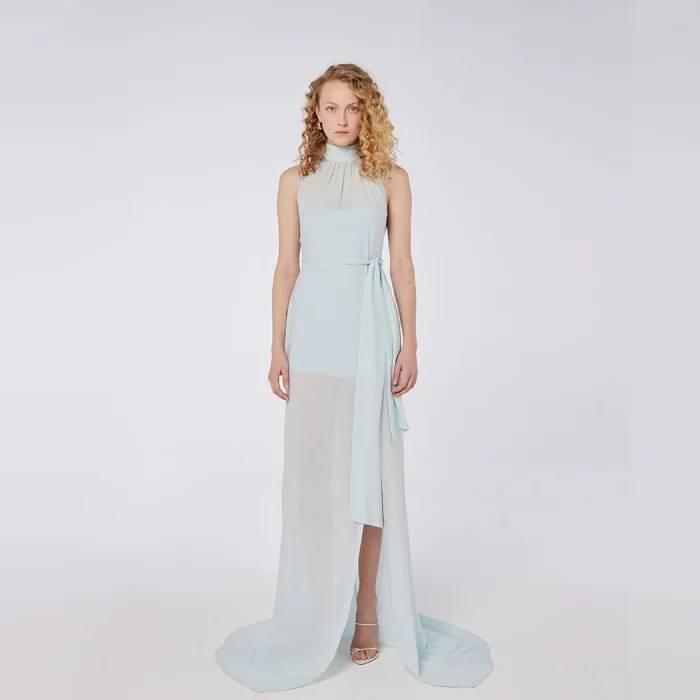 • High-neck halter dress with a flowing, dramatic silhouette.