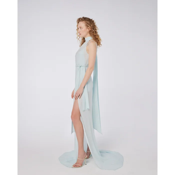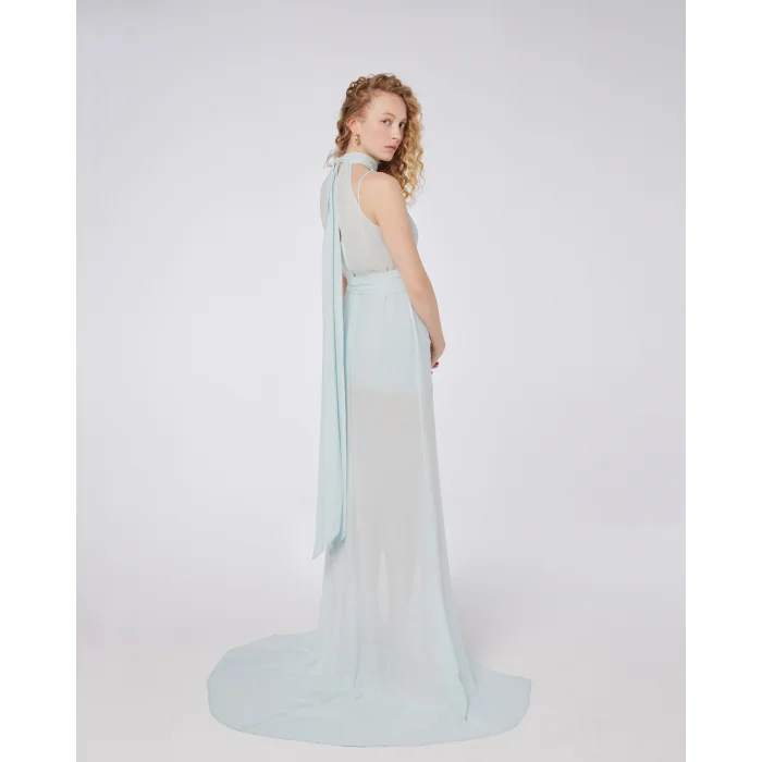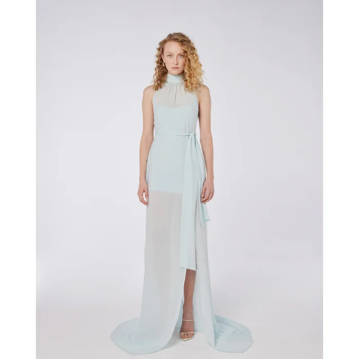 High-neck halter dress with a flowing, dramatic silhouette.Extended back train adds an elegant, statement touch.