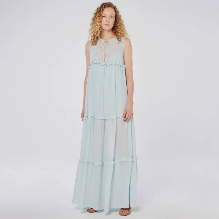 A timeless and airy maxi dress designed for understated elegance, blending fluid layers with delicate details for a versatile, sophisticated look.