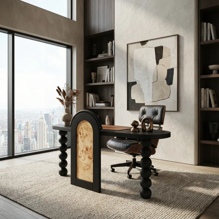 Designed with the Cluttercore trend to add a unique touch to workspaces, the Ciel family's desk adds character to the space with its unique form and elegant lines. Thanks to its triangular form in the upper section, it is placed in harmony with the corner points of living spaces and combines functionality with aesthetics.