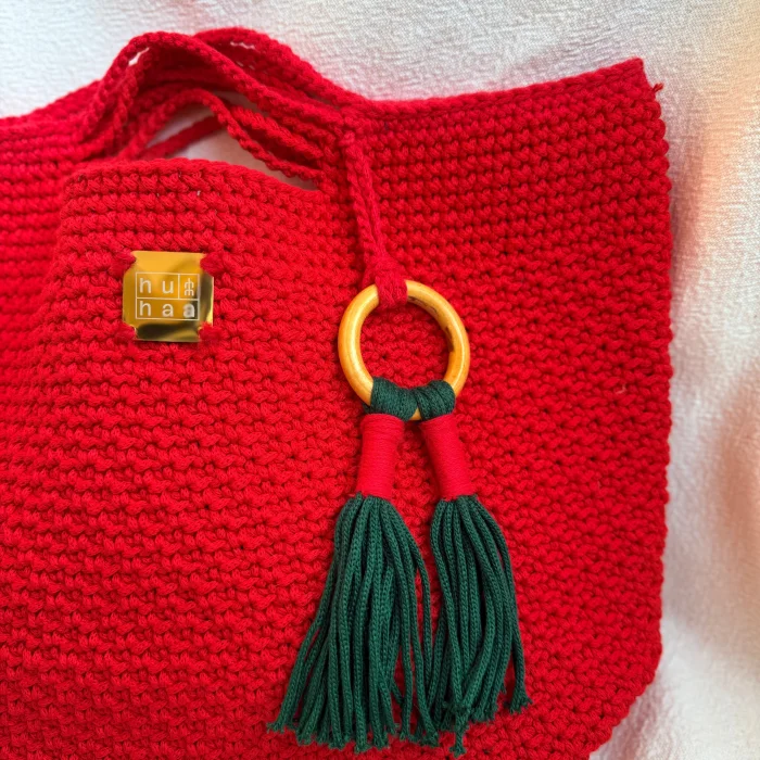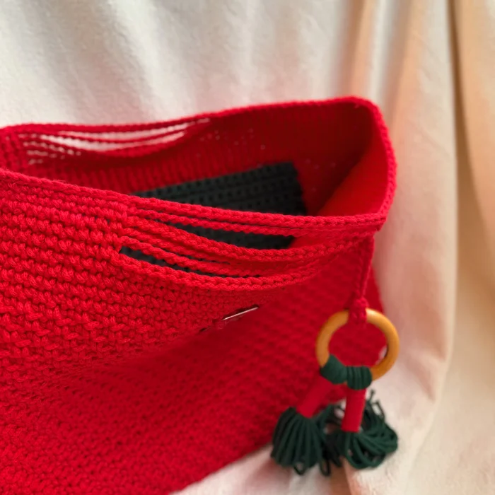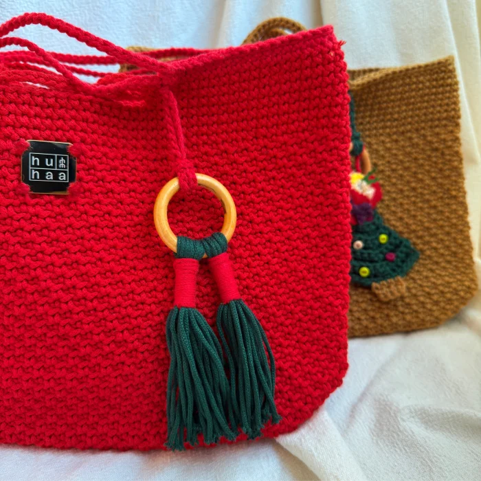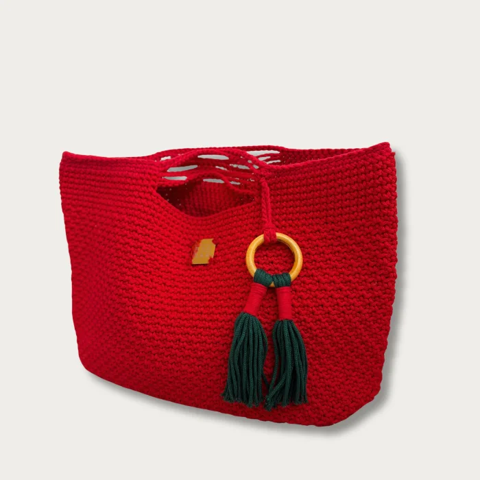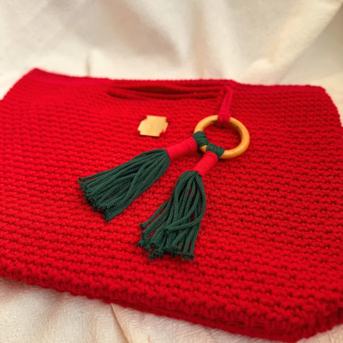 Green tassels and the gold-tone ring detail add a subtle festive character, making it a statement piece for the season.