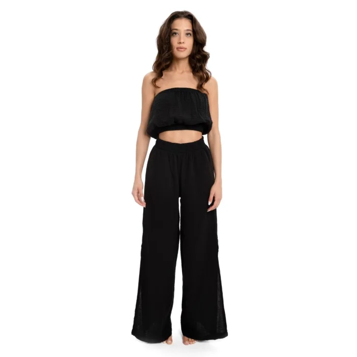 100% Cotton (Muslin). The ideal trousers that you can easily combine in the summer and have SlitSide for slow flow exercises with its soft fabric.