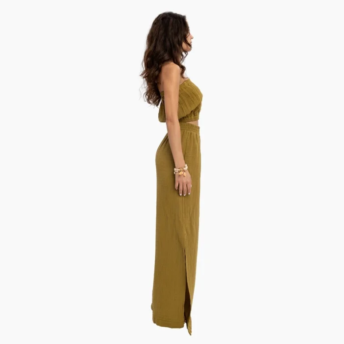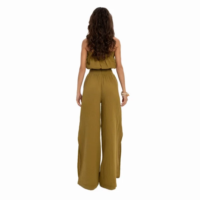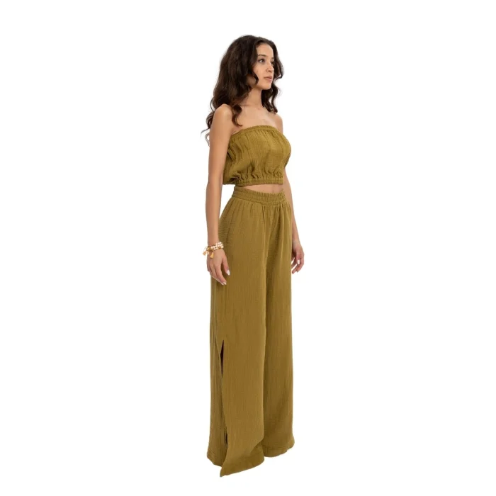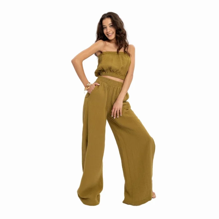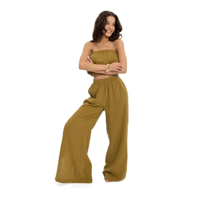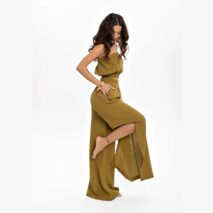 100% Cotton (Muslin). The ideal trousers that you can easily combine in the summer and have SlitSide for slow flow exercises with its soft fabric.