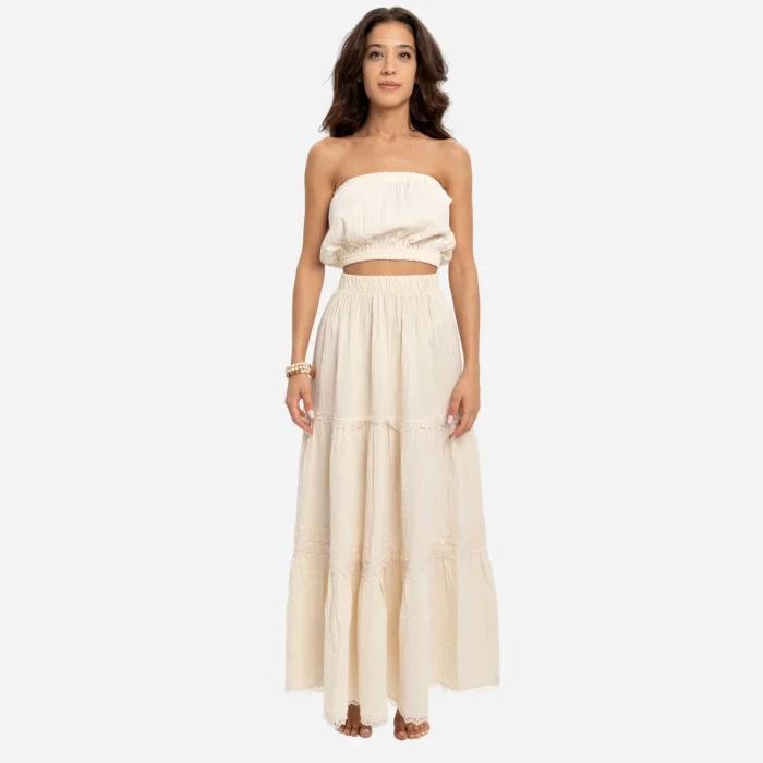 100% Cotton (Muslin). The Sufi Skirt, which you can wear freely throughout the day and combine with many crops, will accompany you in your minimal wardrobes for 4 seasons.