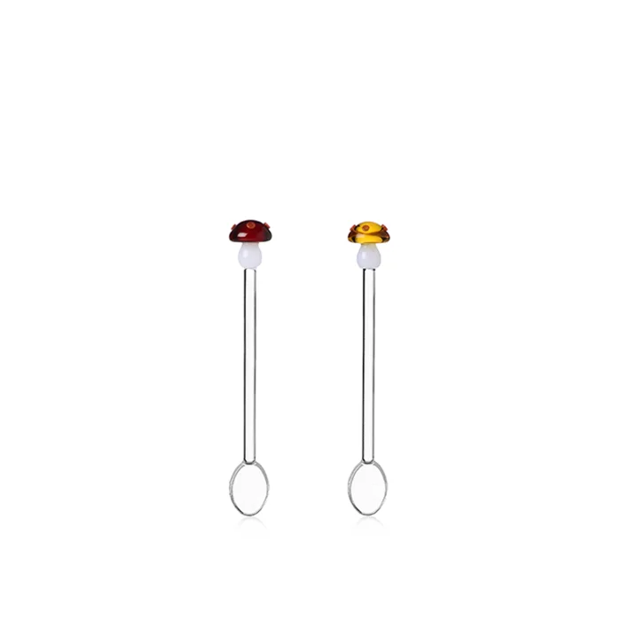 Glass 2 dessert spoons with amber and red mushroom figures from the family collection. Product Details:. Material: Borosilicate Glass. Size: Height: 15cm. Production: Handmade and Flame Processed.. Product Care:. Dishwasher safe at low temperatures (40° recommended). It is suitable for food consumption.