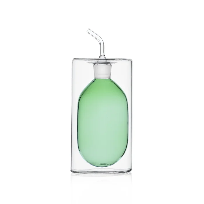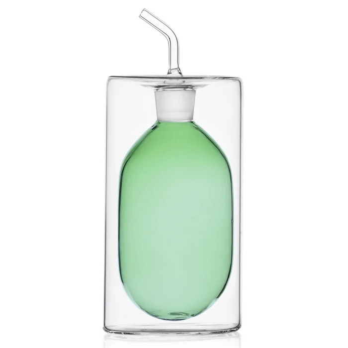 This green oil pot from the Cilindro Collection adds an aesthetic touch to the tables with its modern design and elegant glass workmanship. The cylindrical form created by two interlocking glass layers offers both a functional and decorative stance, while a stylish contrast is achieved thanks to the green inner chamber. The thin tube mouth design ensures controlled and drip-free use, while the heat-resistant borosilicate glass material guarantees long-lasting use. The Cilindro oiler is the ideal choice to present your olive oil and special liquid mixtures with elegance. SKU: 09370067