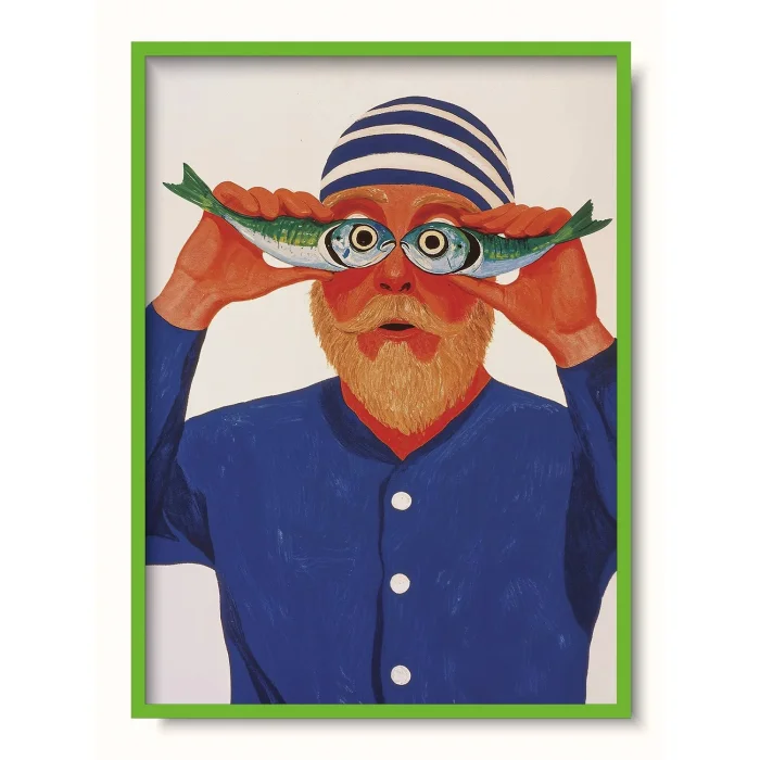 A sailor holding two fish to his eyes like glasses.
