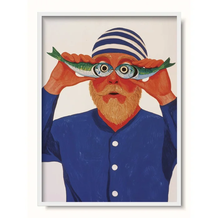 A sailor holding two fish to his eyes like glasses.