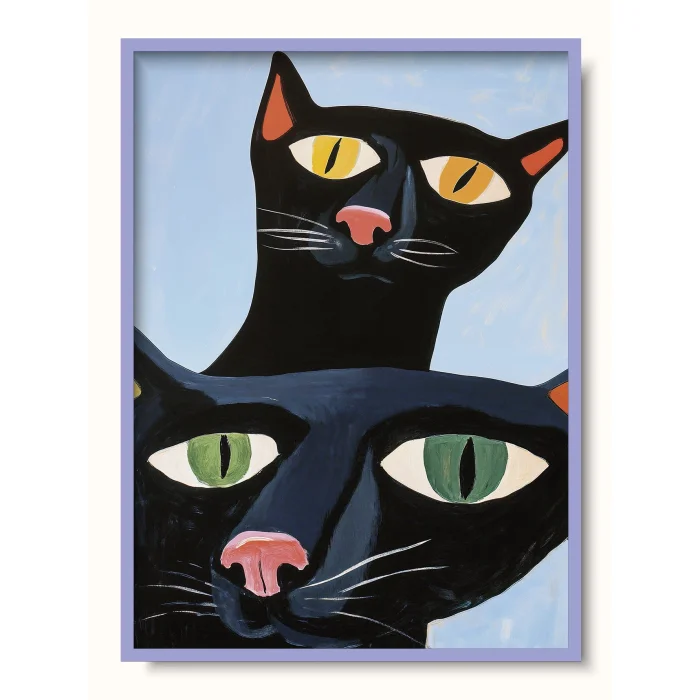 Two black cats curiously looking directly at the viewer.