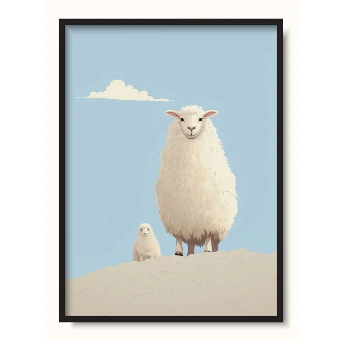 An extremely fluffy depiction of a sheep and its lamb standing on a hill.