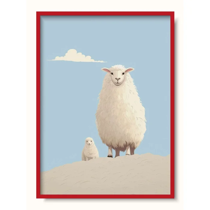 An extremely fluffy depiction of a sheep and its lamb standing on a hill.