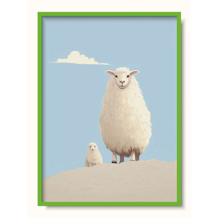 An extremely fluffy depiction of a sheep and its lamb standing on a hill.