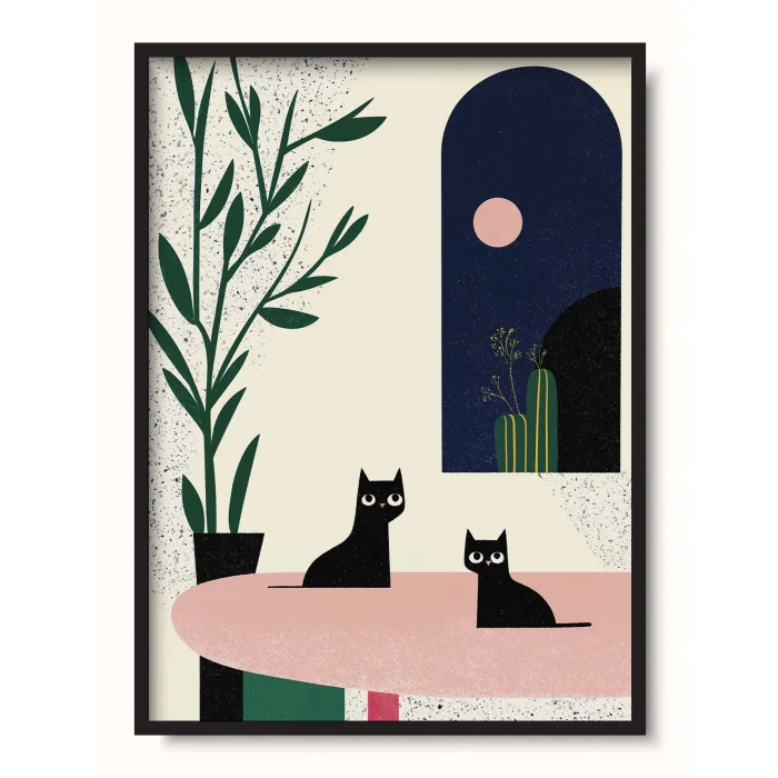 Two cats sitting at a soft pink table, looking at the viewer with wide, curious eyes.