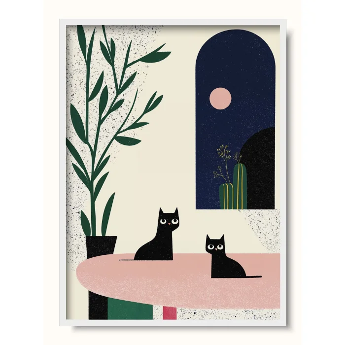 Two cats sitting at a soft pink table, looking at the viewer with wide, curious eyes.