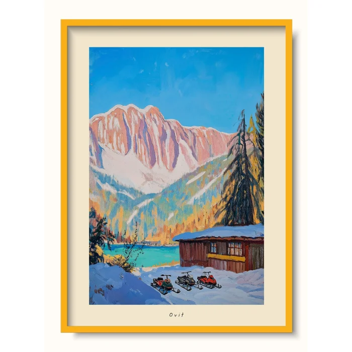 Steep Ovit Mountains rising in shades of beige and pink against clear blue skies and a cabin standing by the lake.